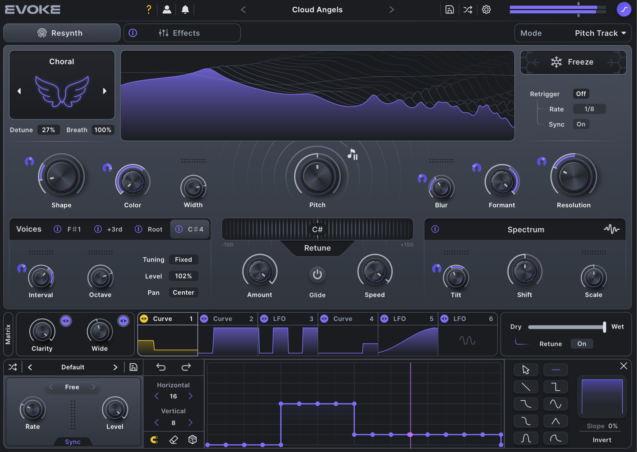 Pitch Trackモードを使うことで、Evoke はソースとなるボーカルのメロディを自動で追従し、